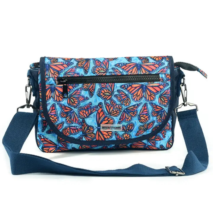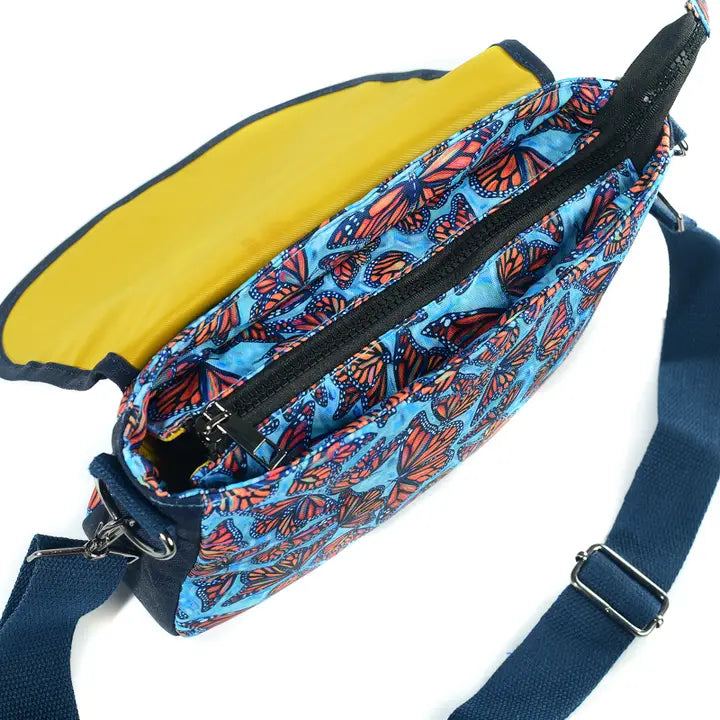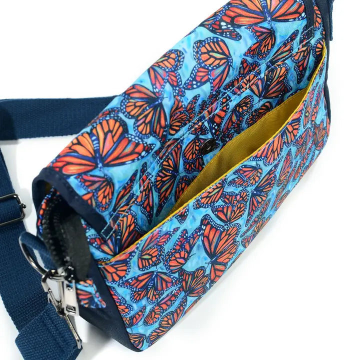 Majestic Monarchs flutter and float in this striking collaboration with Florida artist Samm Wehman! Hit your stride with this "just right" crossbody! It has all of the space and compartments you need to keep things light and organized! The main compartment has a flap with a hidden magnet closure for quick and easy closing. -Measures 10 inches wide x 7.5 inches tall x 2.5" deep -3 zippered compartments, 1 open back pocket with magnet closure and inner organizational pockets. -Includes a removable and adjustable soft-touch cotton strap that adjusts to 53" in length. -Made with 100% recycled water-resistant polyester and a silky smooth easy-clean nylon liner. Magnetic Closure.