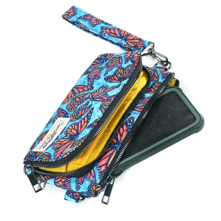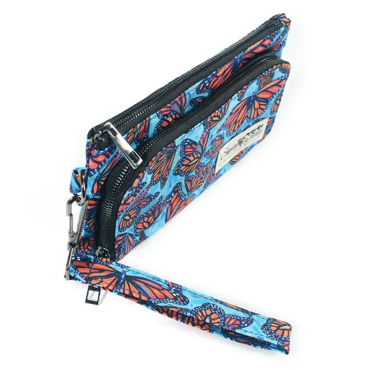 Majestic Monarchs flutter and float in this striking collaboration with Florida artist Samm Wehman! The wallet compartment includes 6 designated card slots, a zipper change compartment and a cash or receipts sleeve. The larger zippered compartment fits a passport and most smart phones. Go hands-free by adding on one of our 28-51" straps or sliding onto your own belt so you can easily sling your wallet around like a crossbody, wear as a waist belt or keep close to your chest for security. -Measures 8.25" long x 4.5" tall x 1" deep, the larger compartment measures 7.75" x 4" and is pictured containing an iPhone 11 pro with case. -6 designated card slots, zippered change compartment, cash sleeve -Premium water resistant nylon made from recycled plastic, easy clean nylon liner. Metal Hardware.