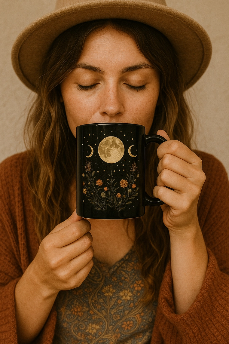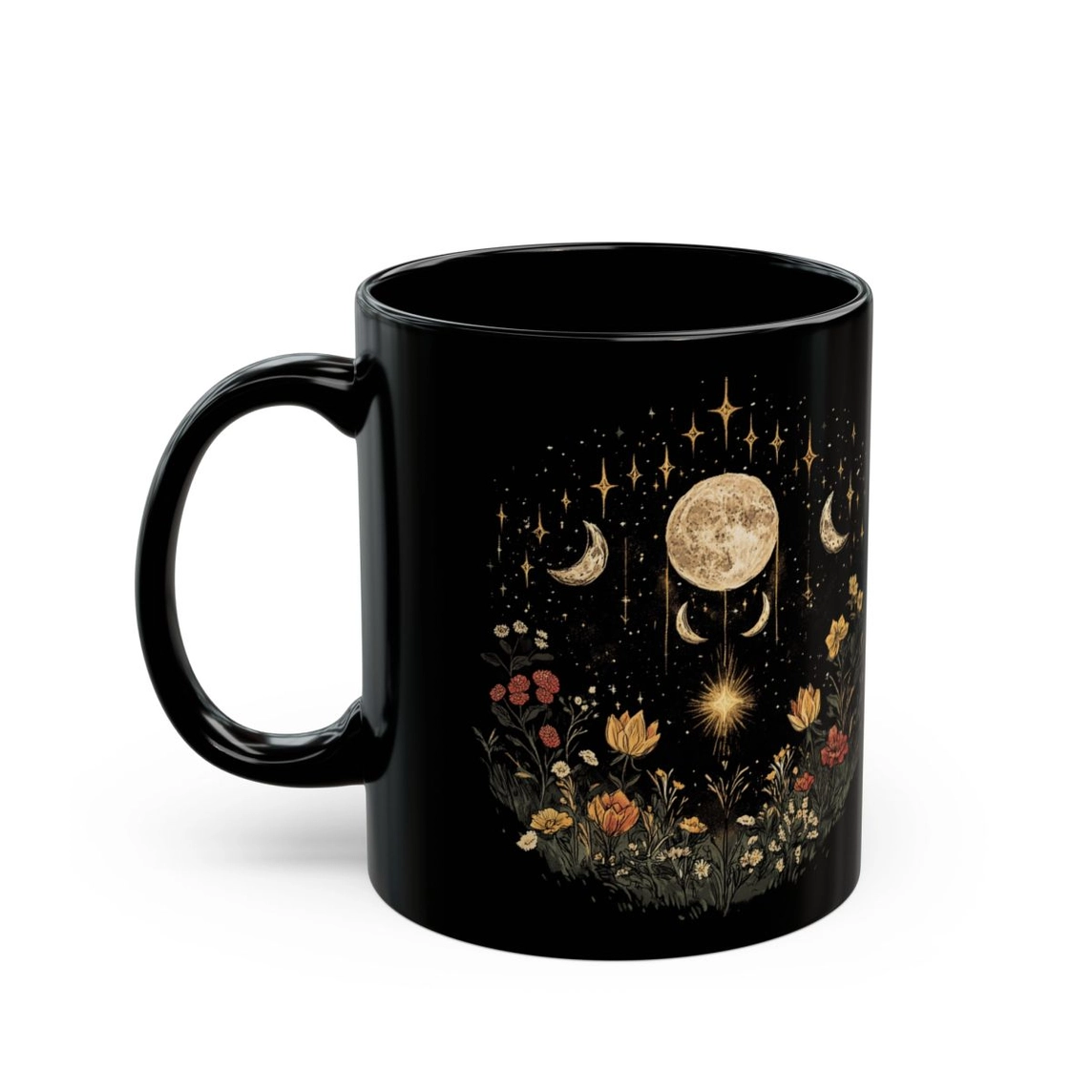 Mystical Serenity... This black ceramic mug features a serene design of a moon among wildflowers, creating a peaceful and serene mood. Perfect for nature lovers and those who appreciate a touch of tranquility in their everyday life. Ideal for gifting on special occasions like birthdays, Mother's Day, and anniversaries.