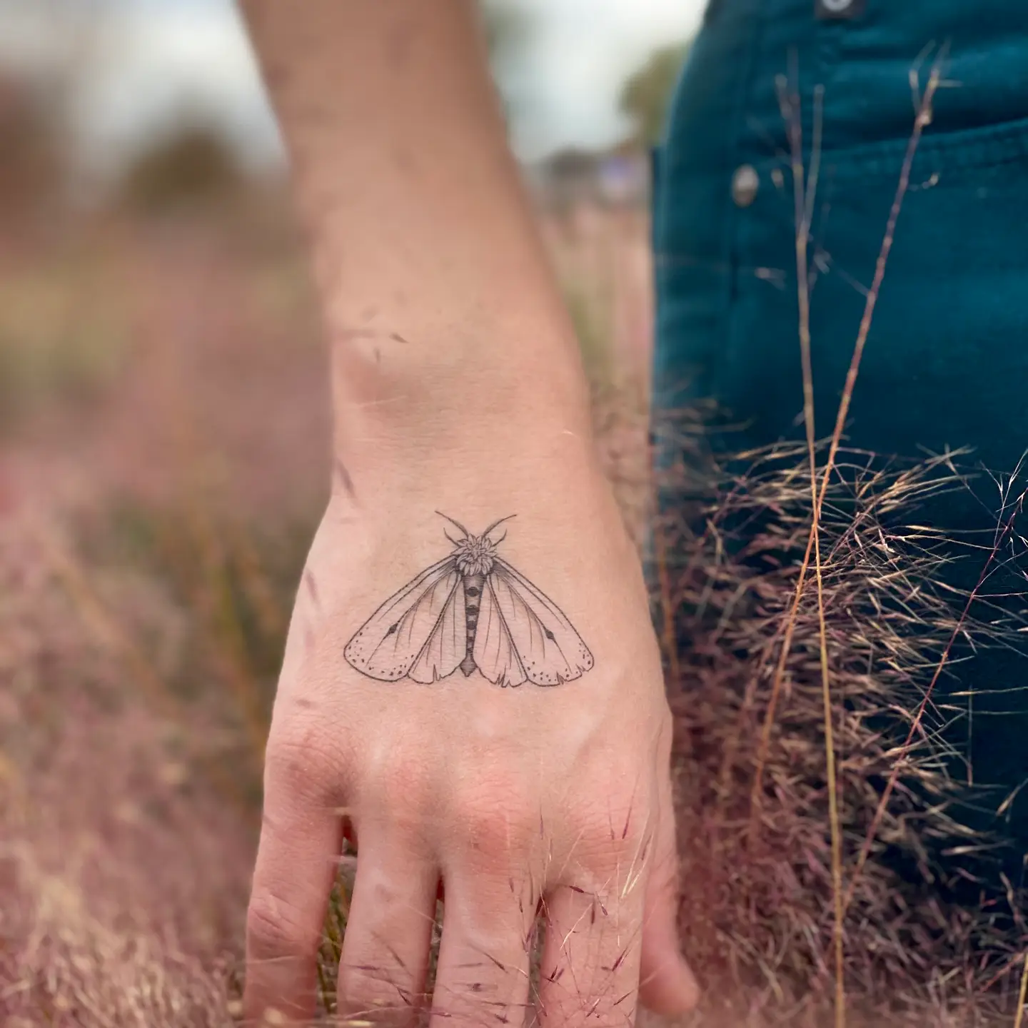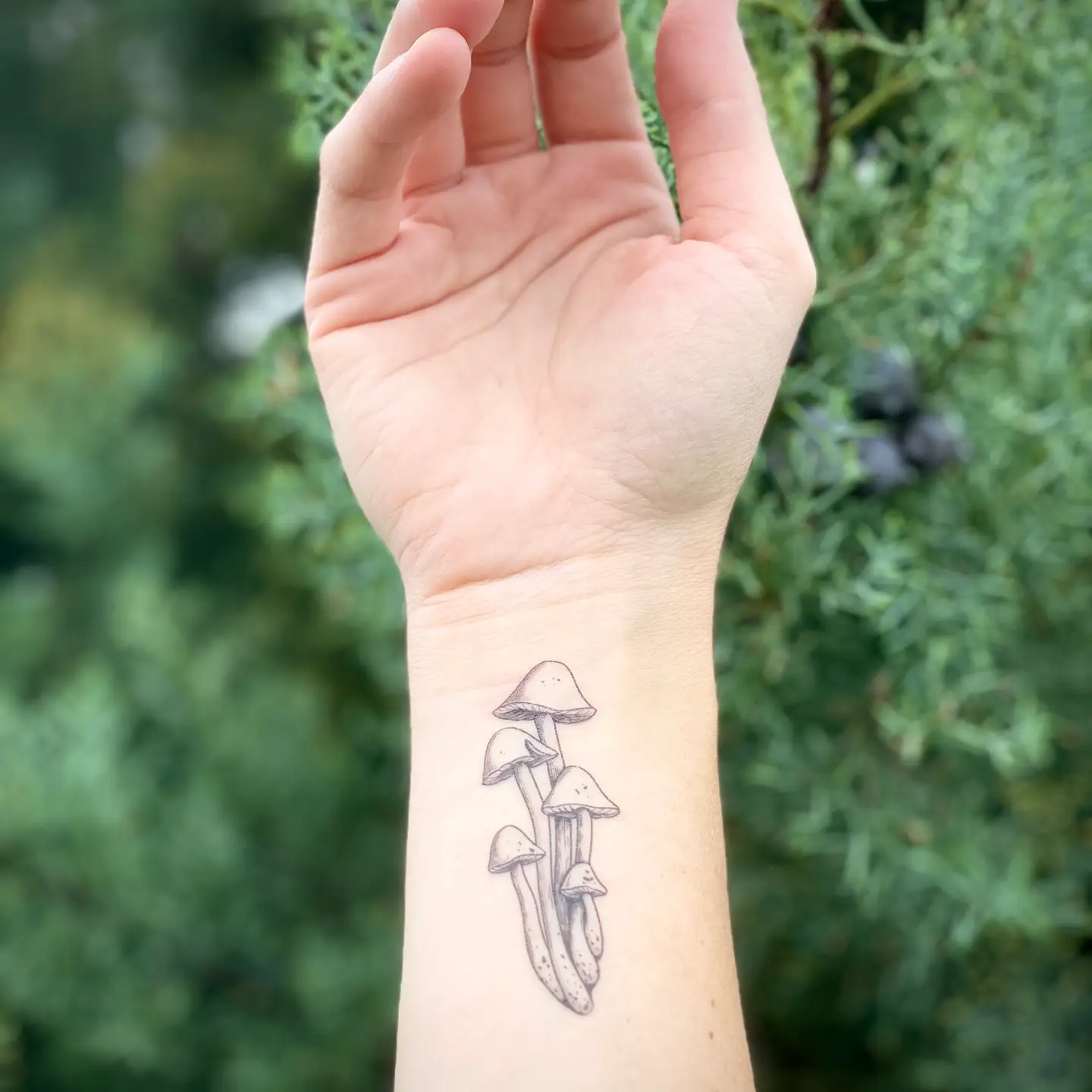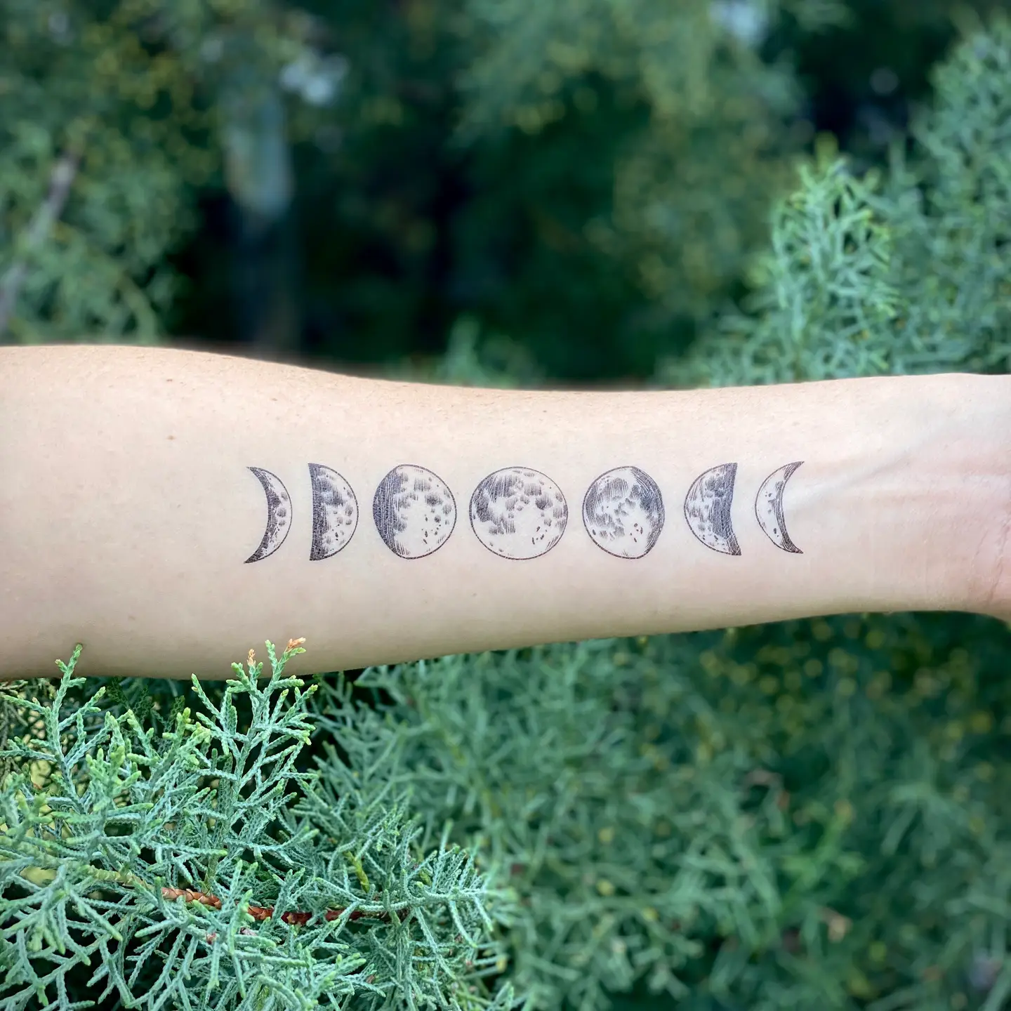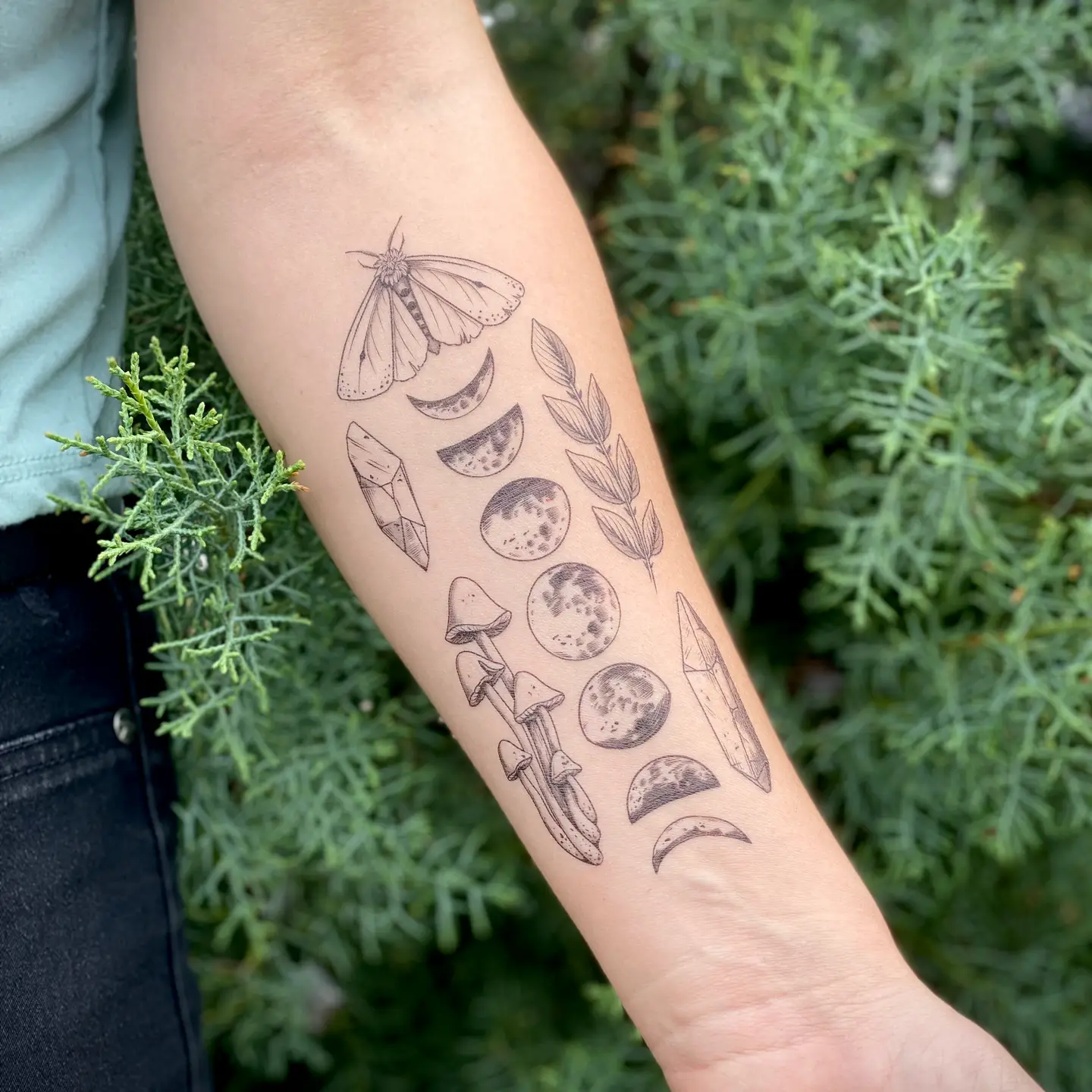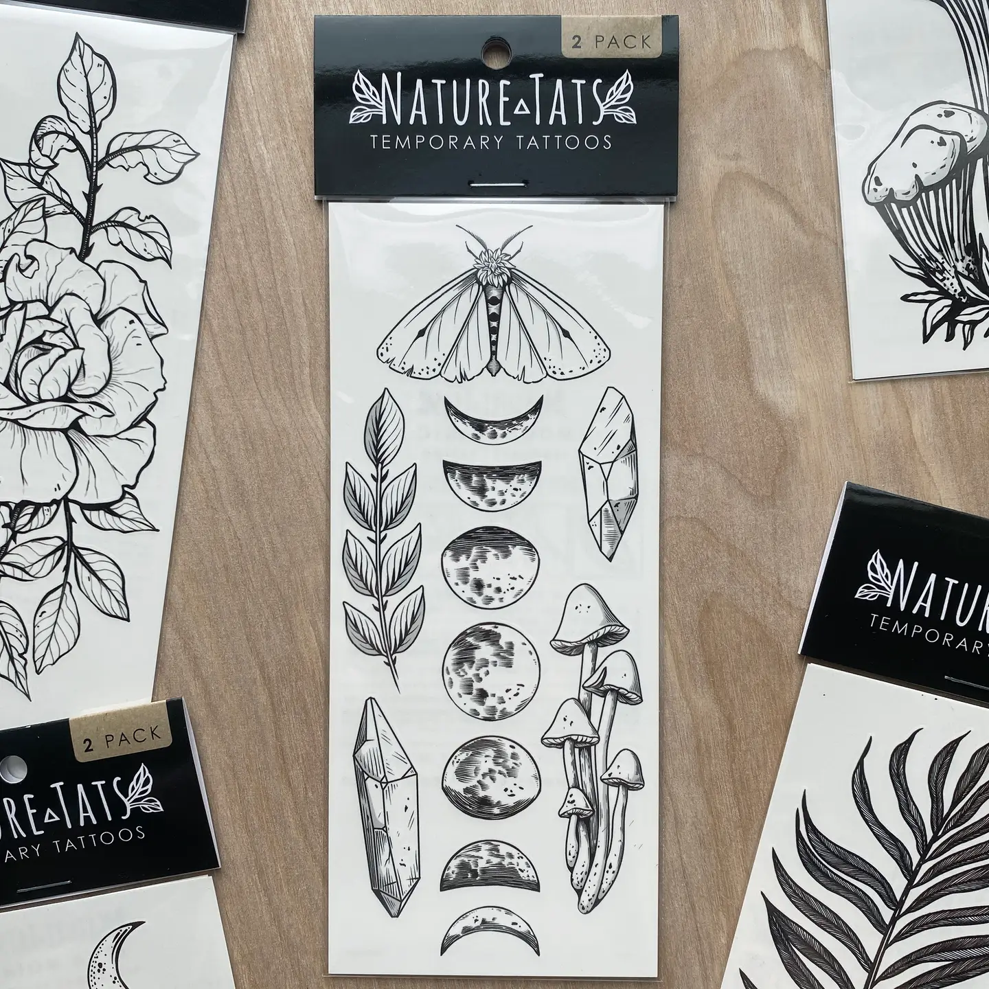 Moon Magic temporary tattoo sheet. This temporary tattoo sheet features a long moon phase design, a slender cluster of wild mushrooms, a leafy sprig, light and fluffy small moth, and two crystal shards.