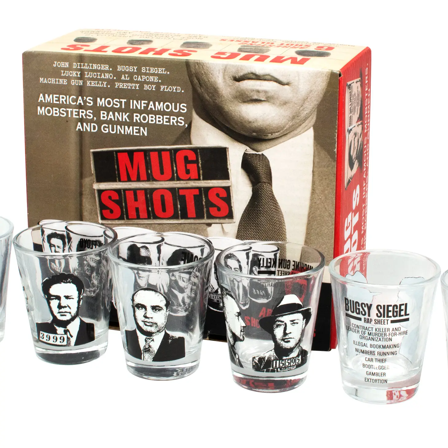 This set of shot glasses features mug shots of six of America's most notorious gangsters. So now you can get shot with Pretty Boy Floyd, Lucky Luciano, Bugsy Siegel, and John Dillinger. 2 oz each.
