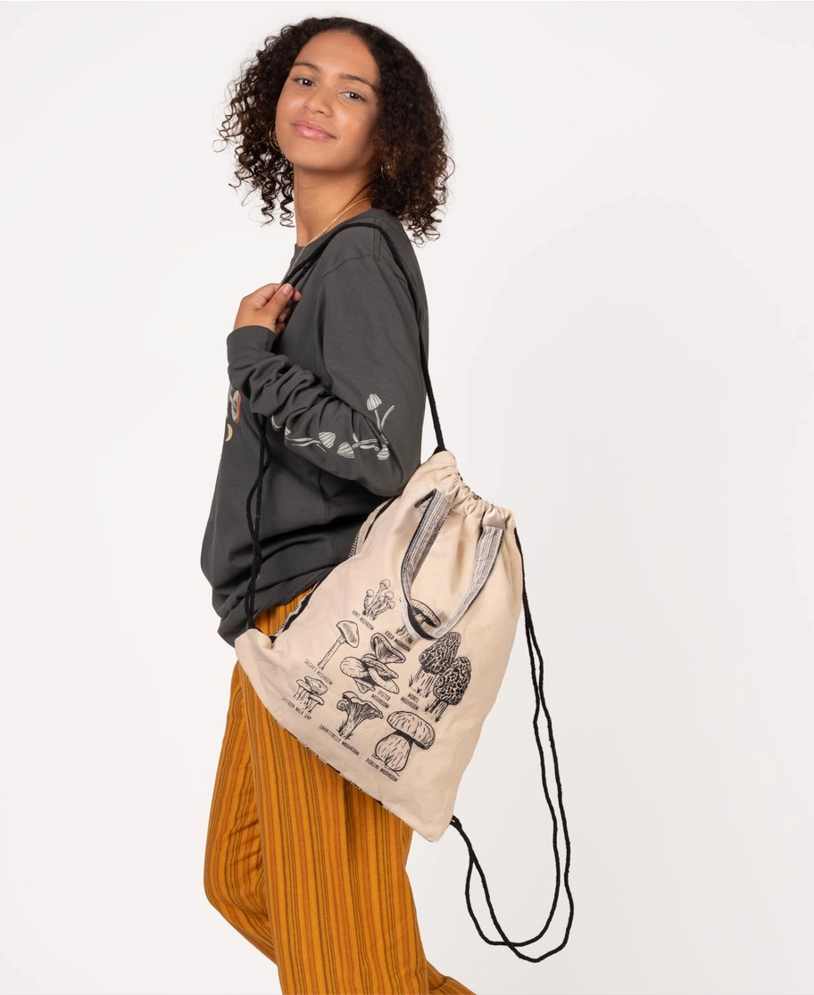 A mushroom foraging adventure awaits! This Mushroom Botanical Cinch String Backpack will work wonderfully to store your water bottle, snacks, tools, and mushroom field guide in its large pouch and inside pocket. Its drawstring closure will keep your items snug inside. Includes a top rainbow handle for easy carrying. Featuring a Soul Flower print of edible mushrooms: Honey, Field, Morel, Oyster, Caesar's, Saffron Milk Cap, Chanterelle, and Porcini. 14 x 17 inches, Straps cinch from 25-36 inches. Natural.