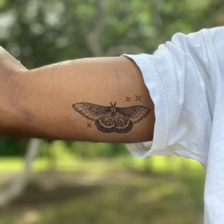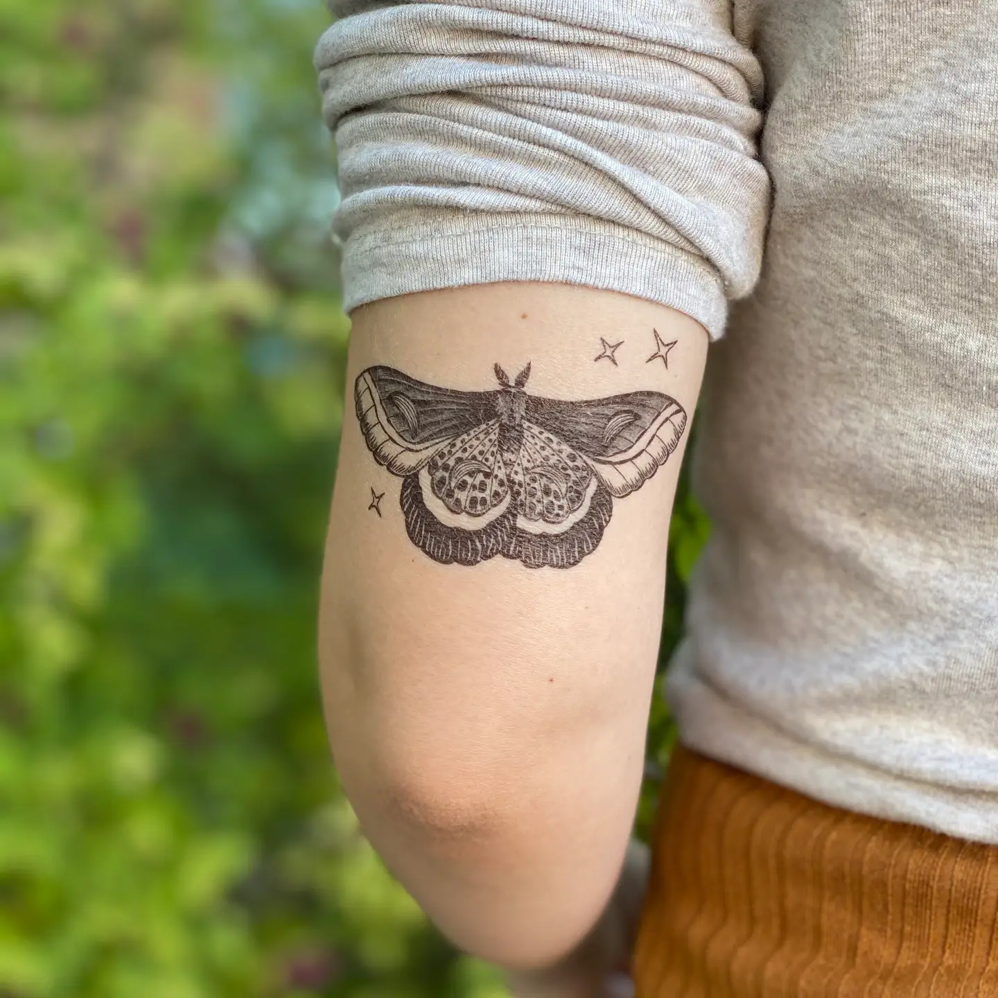 Night Moth temporary tattoo. Moths are widespread throughout the world, thousands of different species serve many functions within their environment. Some are essential pollinators, many are nocturnal and an abundant food source for mammals, reptiles, fish, other insects, and even humans.