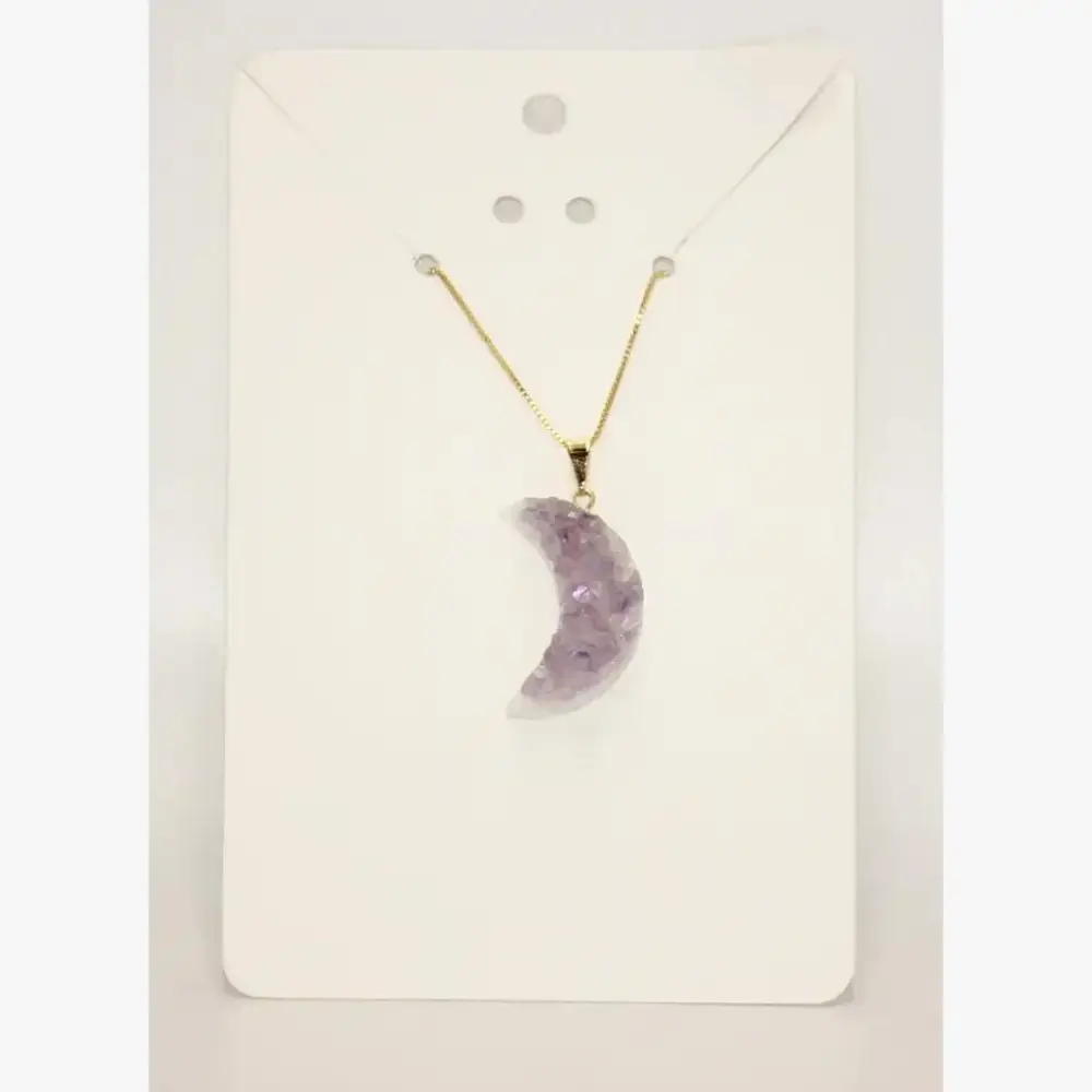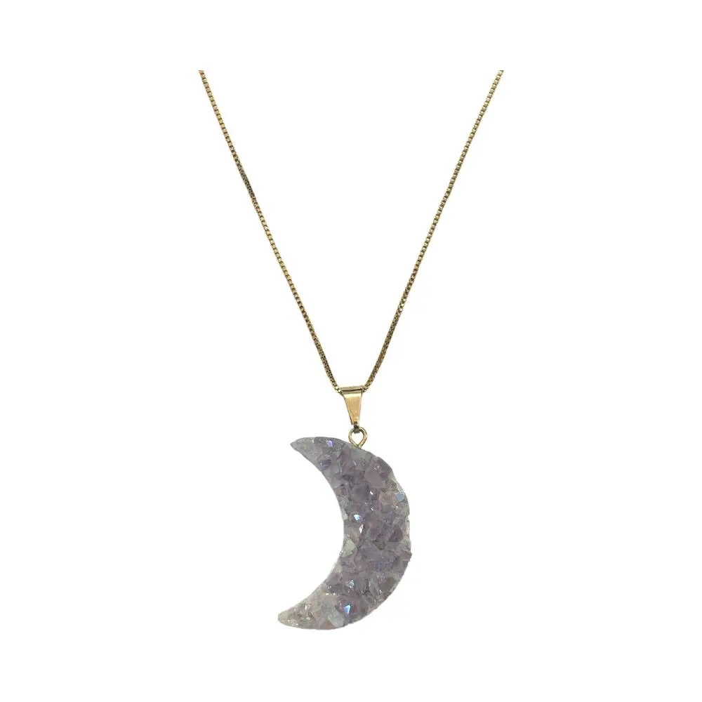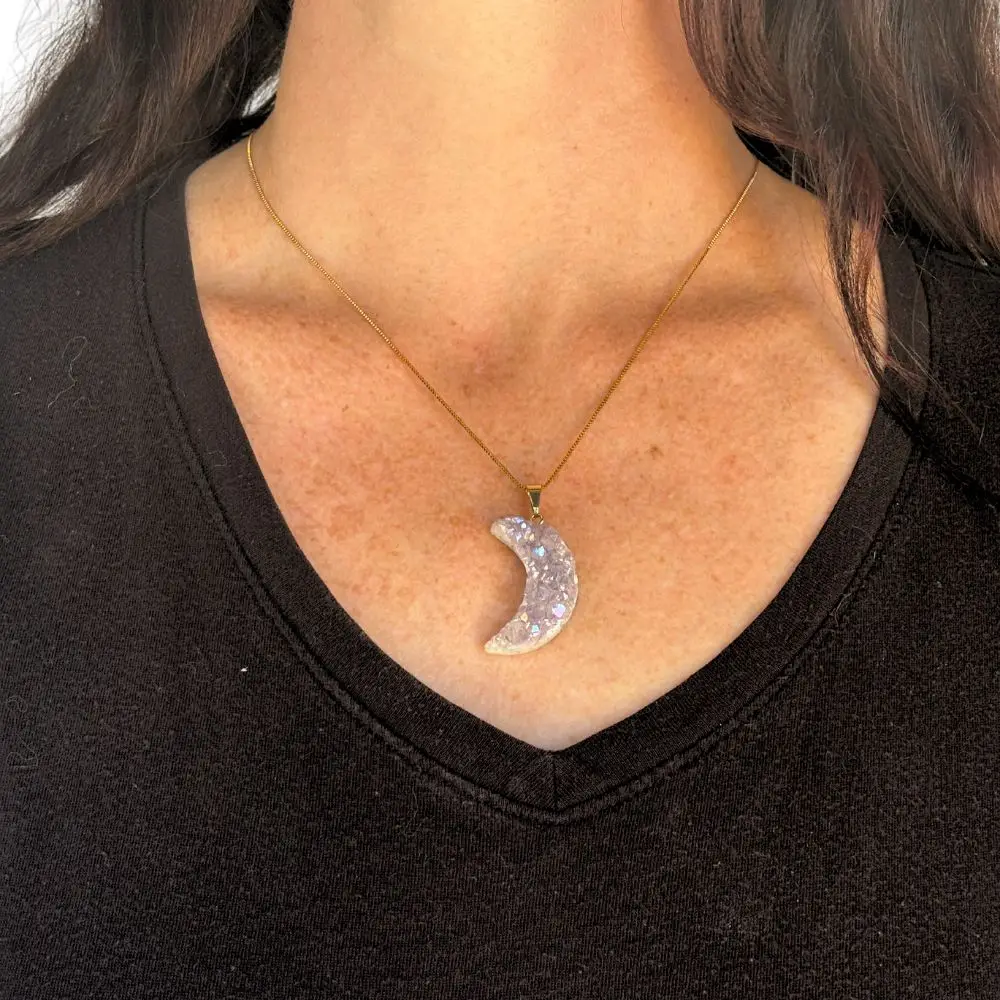 Dive into celestial elegance with this Pearl Druzy Moon Necklace, showcasing a crescent moon pendant adorned with shimmering pearl Druzy crystals. Hanging gracefully from a silver plated chain, this ethereal creation is designed for wholesale purchase, offering the perfect gift for those seeking beauty, serenity, and spiritual connection. Embrace the enchanting allure of crystals with this distinctive and captivating accessory.