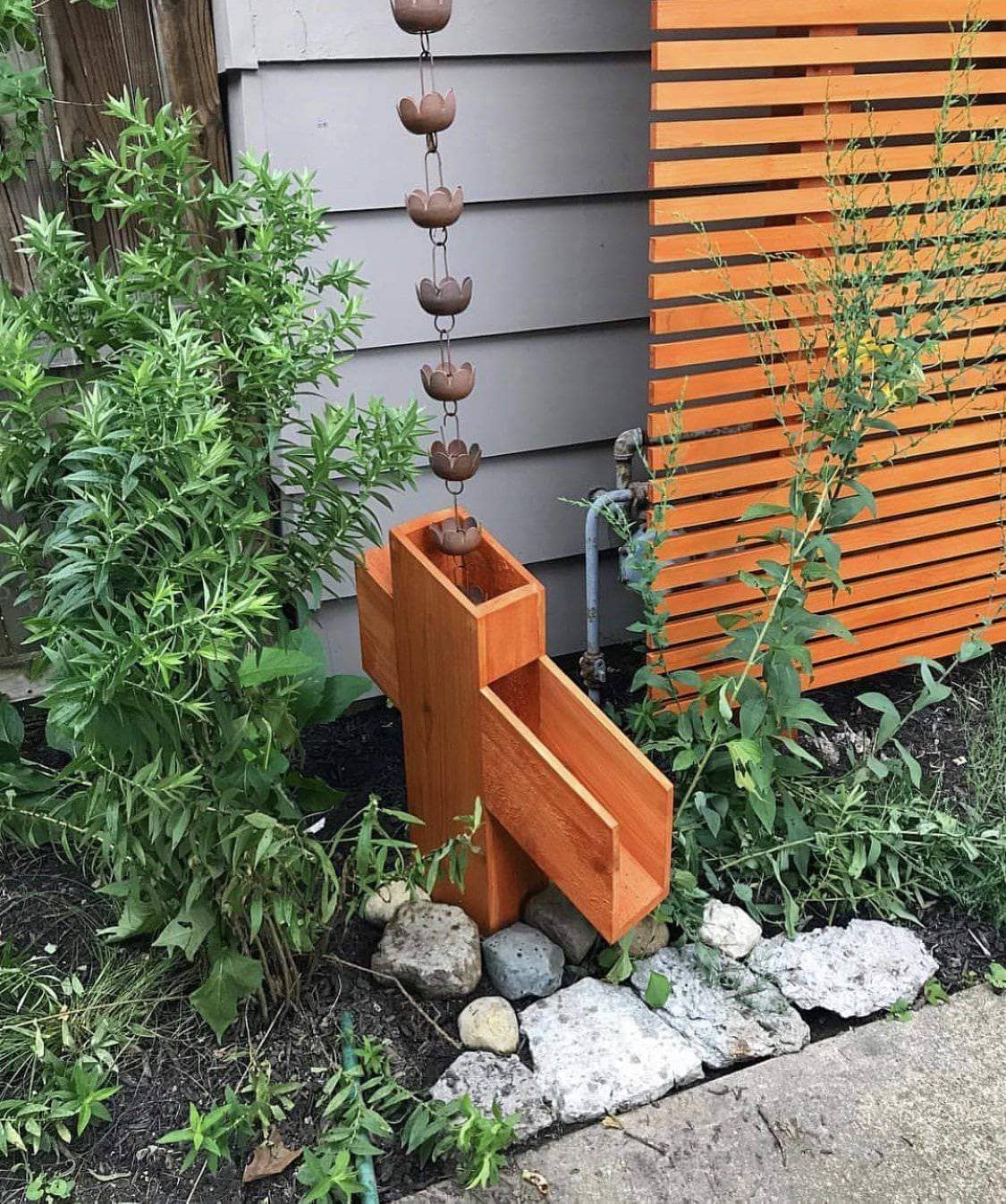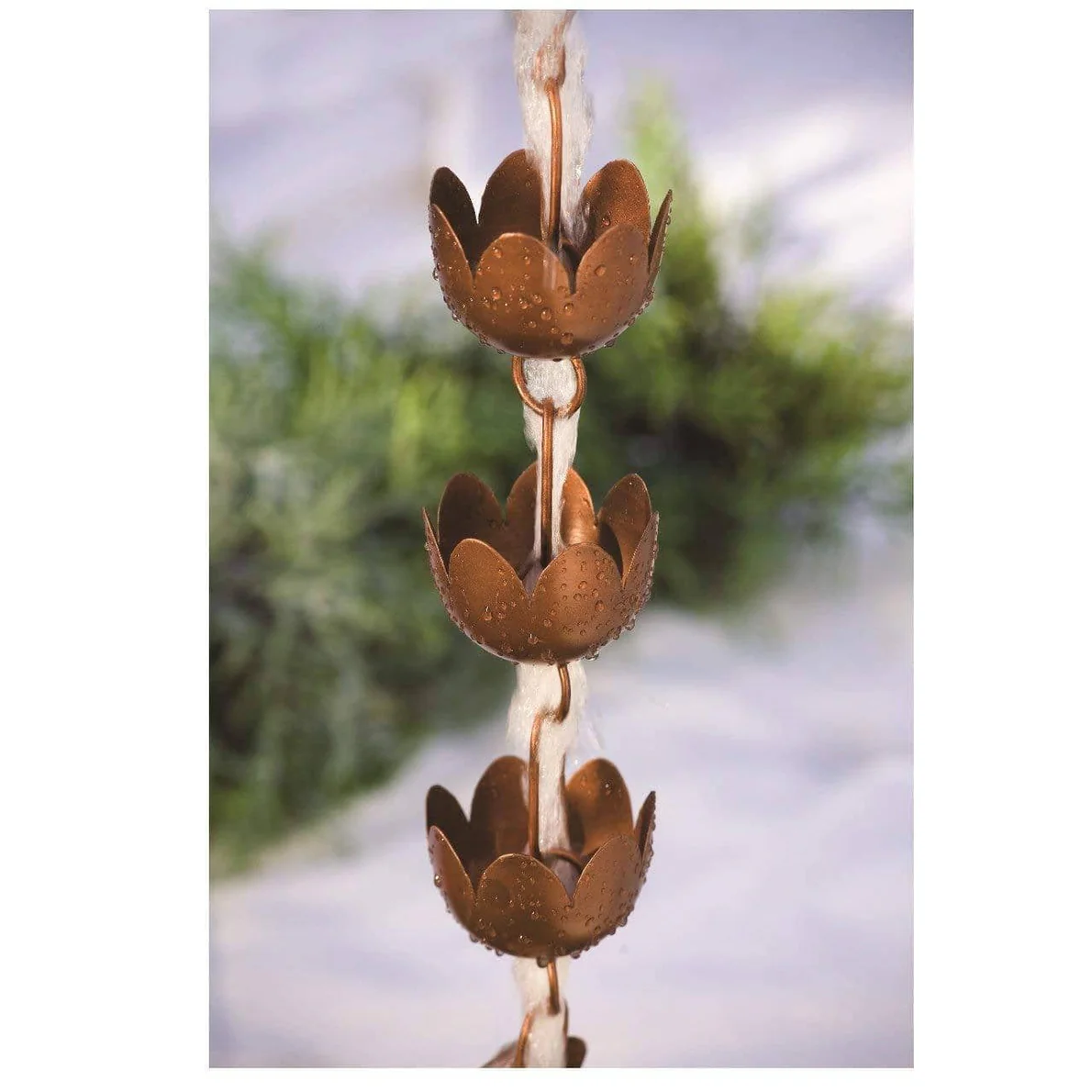 A lovely accent for your home! Our Flamed Lily Cup Rain Chain is lovely in all kinds of weather, and it takes on the important task of directing the flow of water whenever wet weather wanders your way. A beautiful flamed finish provides a slightly iridescent glow, making this rain spout alternative the perfect adornment for your eaves. Add a matching receptacle to create a stunning focal point!