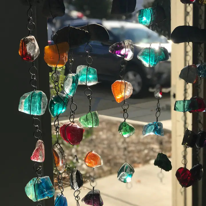 Recycled Art Glass & Rock Rain Chain is 100% handmade with recycle art glass. Color and length are random, averaging 4ft. Color will never fade, no paint nor glaze were used and safe for the environment.