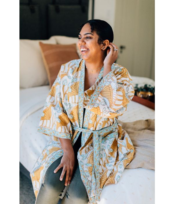 When it's time to take it easy, grab your soft cotton, block print Rest & Relaxation Robe! This robe is handcrafted by makers working with our fair trade partner Aravali, providing year–round work and fair wages for artisans, so many young adults choose to carry on the craft tradition in local workshops after finishing their schooling.