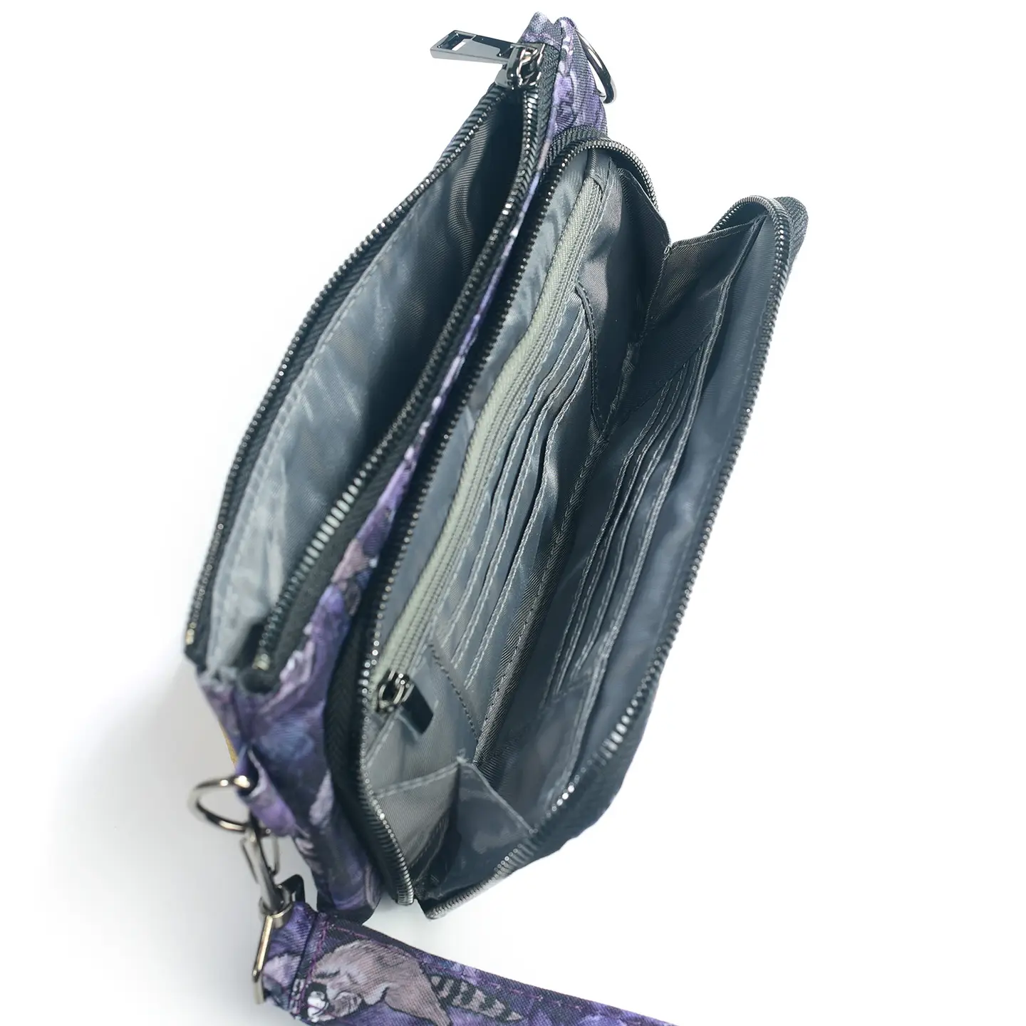 The wallet compartment includes 6 designated card slots, a zipper change compartment and a cash or receipts sleeve. The larger zippered compartment fits a passport and most smart phones.