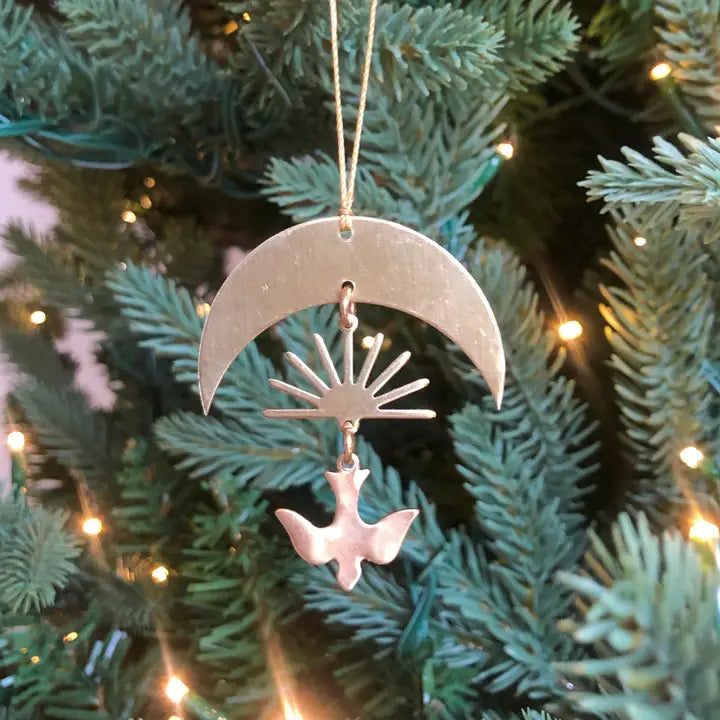 Artisan-crafted story ornament made from hand-cut/hammered brass sheet. Ready to hang. Dimensions: ornament measures roughly 3” tall not including hanging twine. *due to popular demand ships 5 business days. **Please note: our pieces are made by hand by our team of women artisans from hand-cut and hammered brass. Slight inconsistencies, imperfections and the natural beauty of brass are what make our pieces unique. Product Notes: Please be aware that raw brass naturally tarnishes over time; a paste of baking soda and lemon juice applied with a cloth will shine it back up in no time.