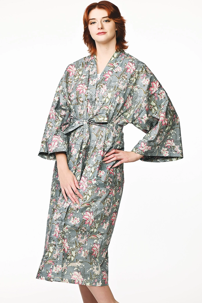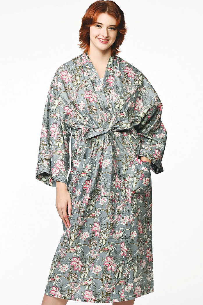 Our luxurious Kimono Robes showcase vibrant artistic prints on 100% soft cotton. Artisans in Rajasthan, India print the fabric for our fair trade robes using eco-friendly dyes. These beautiful cotton robes feature large pockets and are machine washable. One size fits most, 52" length.