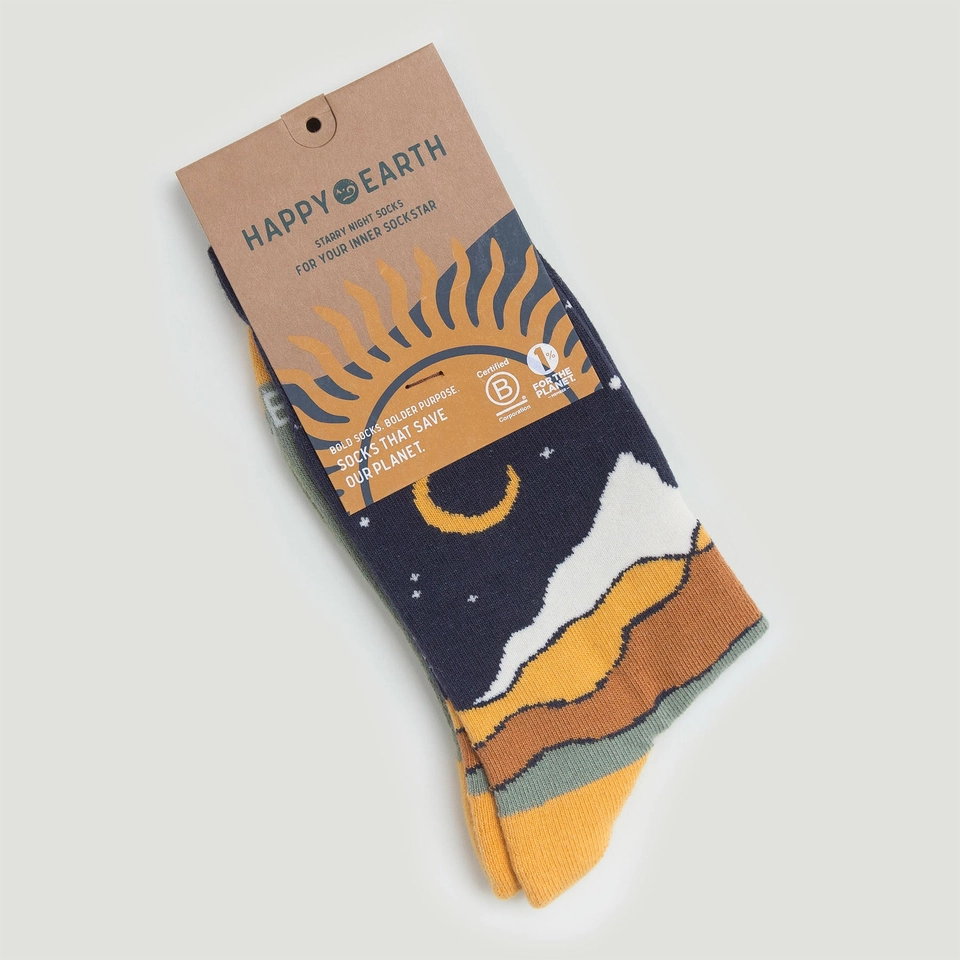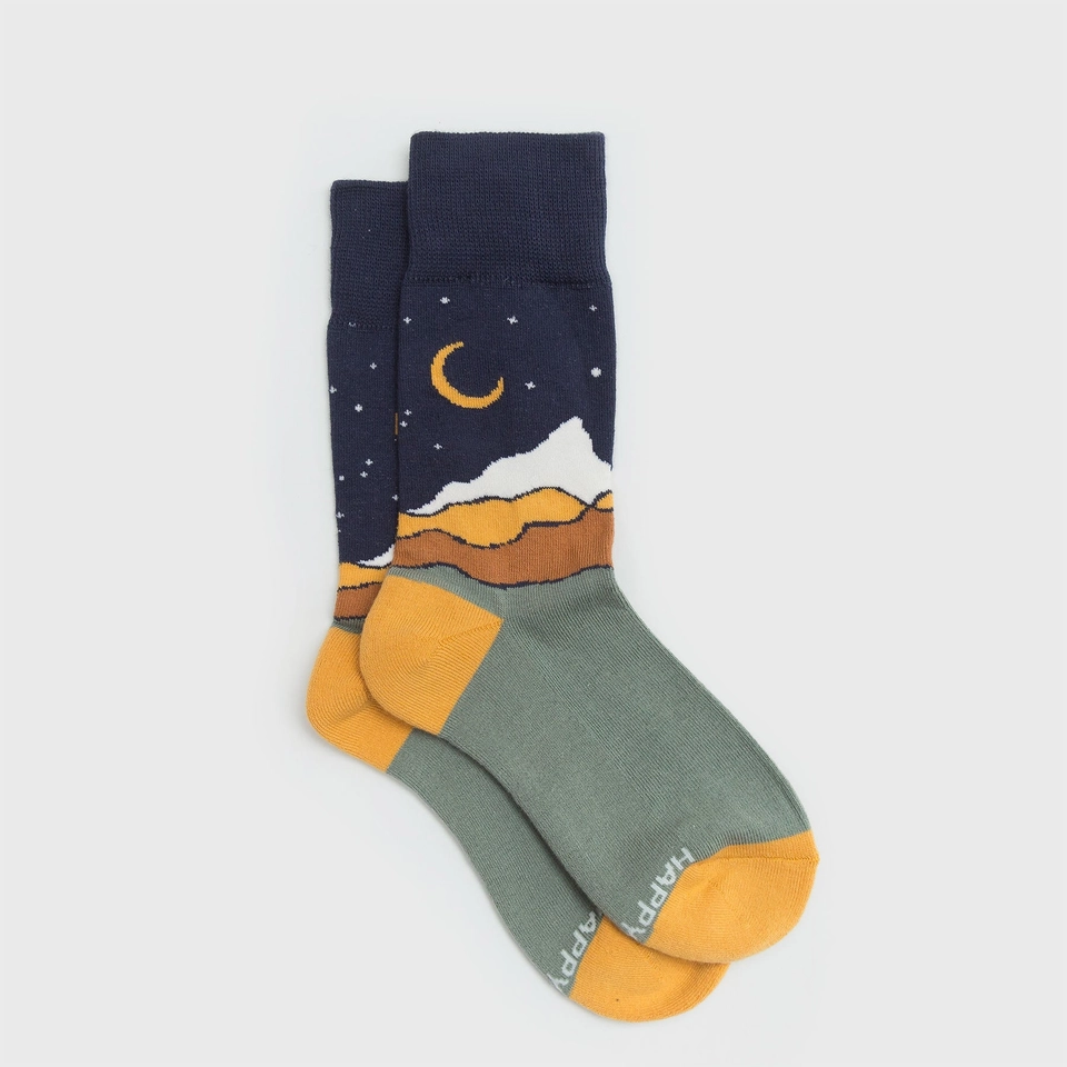 An ode to star-studded skies and mountain peaks. Navy and cool gray body with golden heel and toe, decorated with a mountainous nighttime scene.