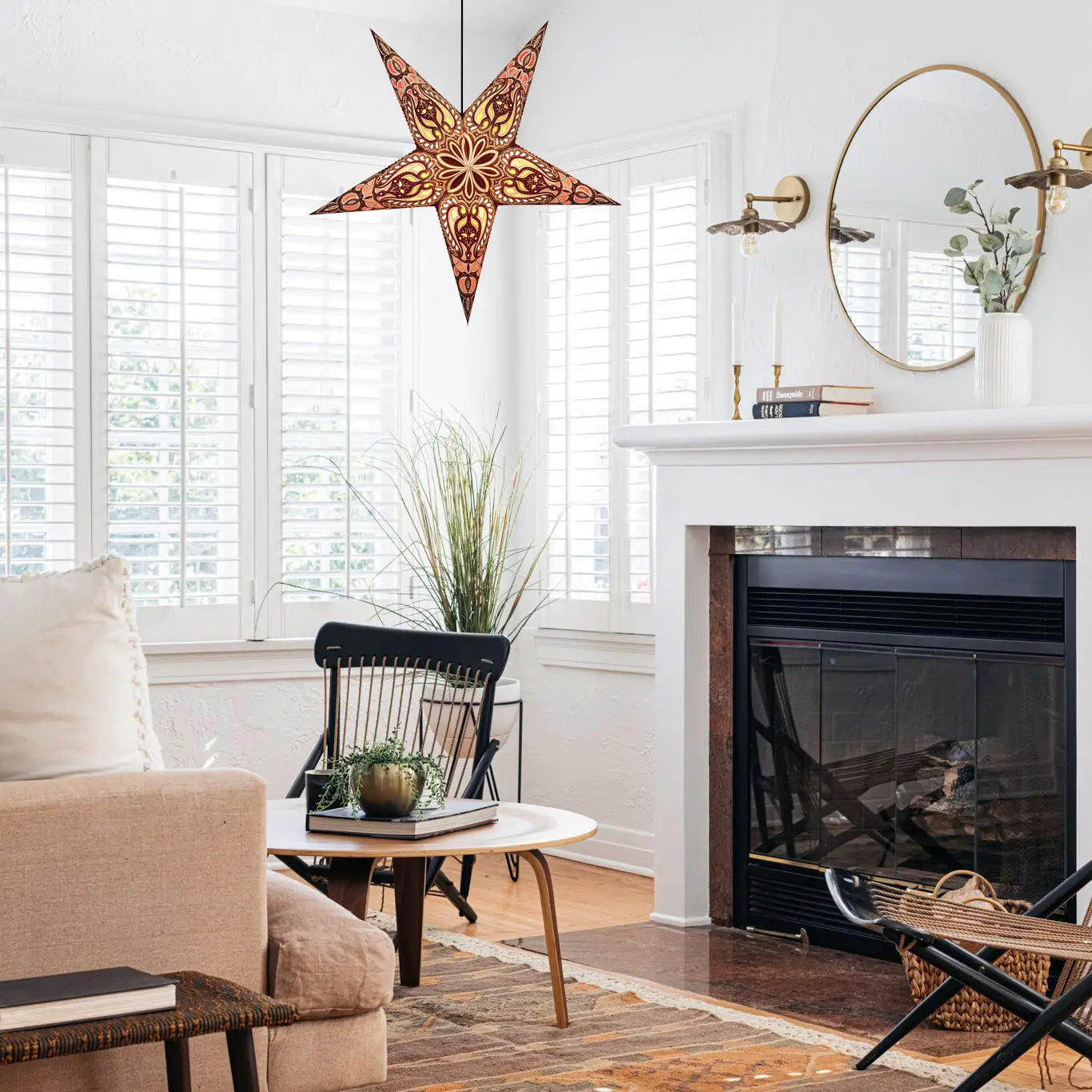 Our star lights are handcrafted in India. They are available in many dazzling patterns. Made with 100% recycled materials, these hanging lanterns create ambiance and a clever accent lighting. "create your om". Lighting Kit is Included.