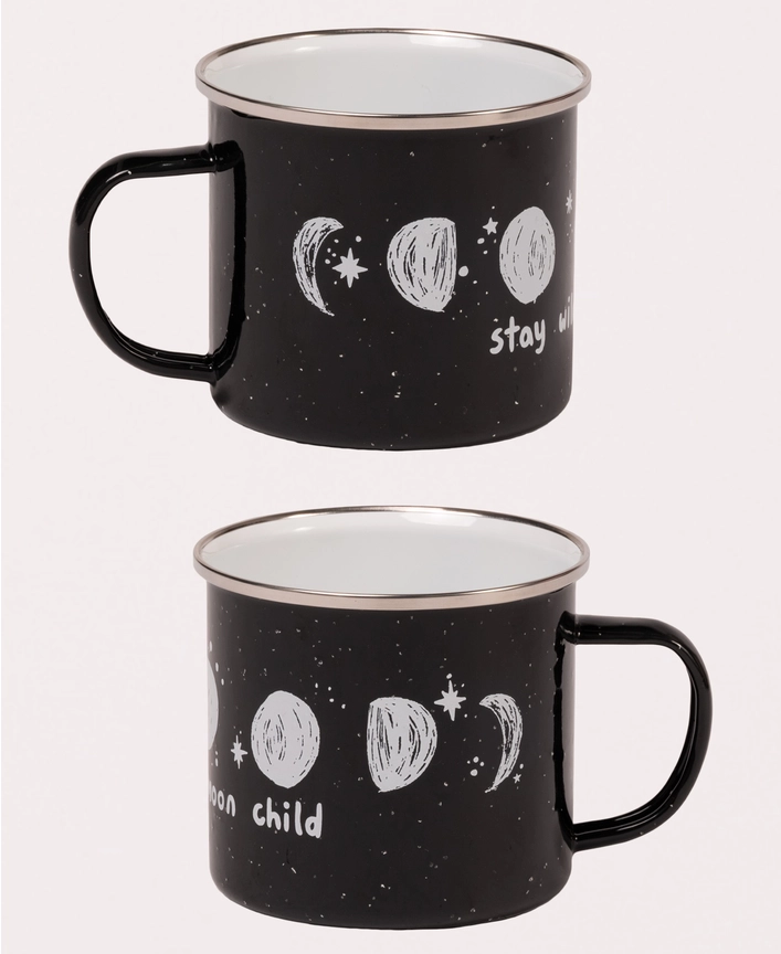 Radiate the light within your soul as you enjoy a cup of your favorite beverage, hot or cold! This Stay Wild Moon Child Enamel Camping Cup features a wrapped print of lunar phases and the message: stay wild moon child. Let your inner moon-child treasure this drinkware with its unique speckled enamel coating and magical moon vibes. Black with speckles.