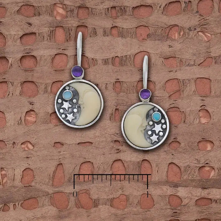 Tagua Half Moon Face with Star, Opal, Amethyst Earrings L643