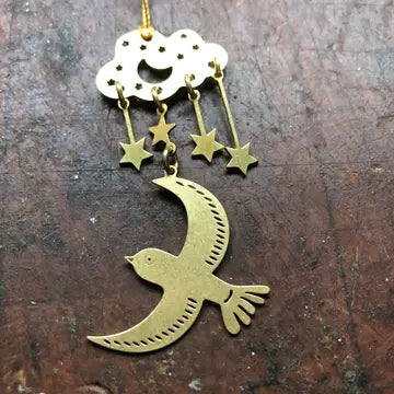 Artisan-crafted ornament made from hand-cut and hammered brass sheet. Ready to hang. Dimensions: ornament measures roughly 4.5” tall x 3” wide with hanging cord. **Please note: our pieces are made by hand by our team of women artisans from hand-cut and hammered brass. Slight inconsistencies, imperfections and the natural beauty of brass and driftwood are what make our pieces unique. Product Notes: Please be aware that raw brass naturally tarnishes over time; a paste of baking soda and lemon juice applied with a cloth will shine it back up in no time.