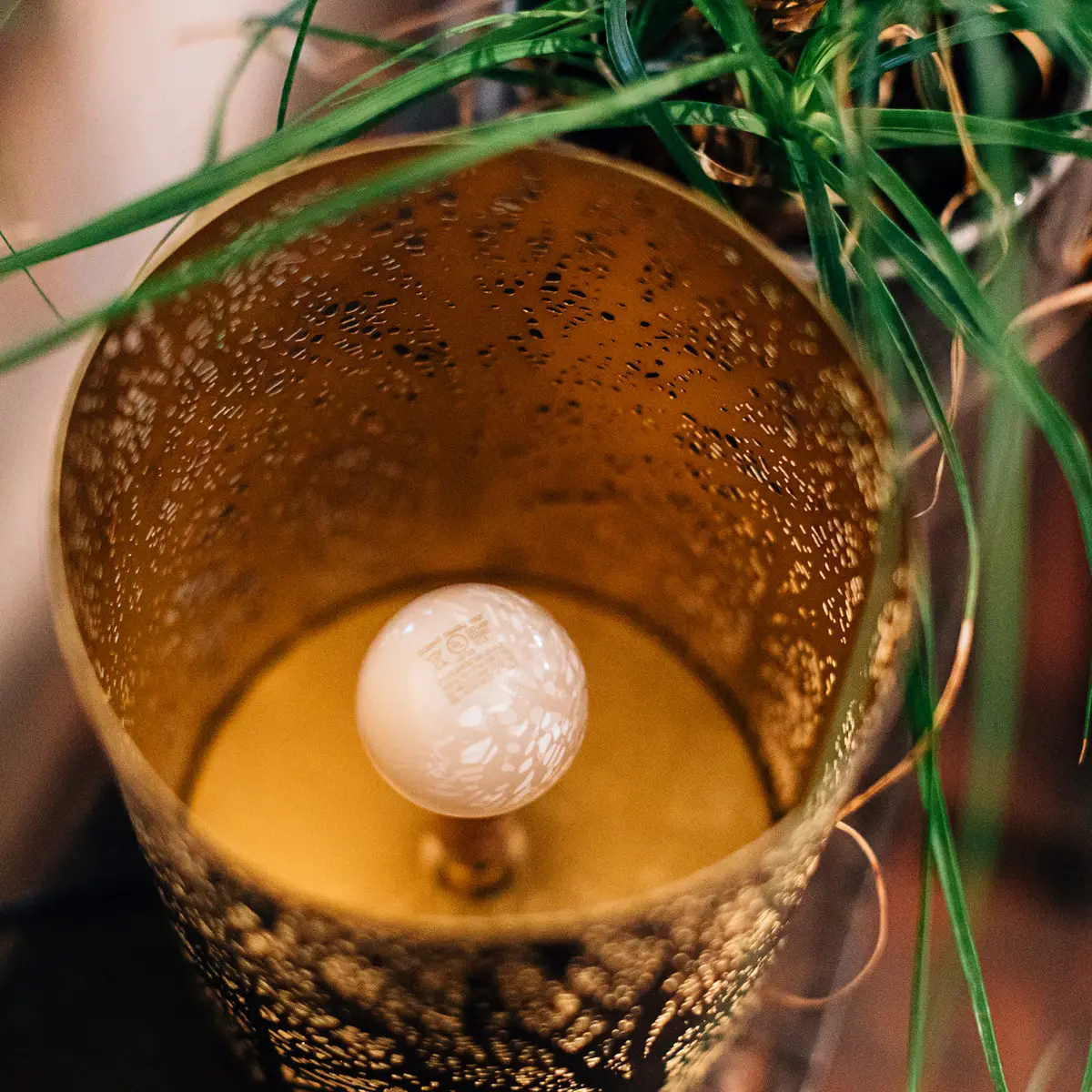 Materials: metal with a gold finish. - 6Dx9H inches - Use up to 40w candelabra bulb. Bulb not included. - Handcrafted in India