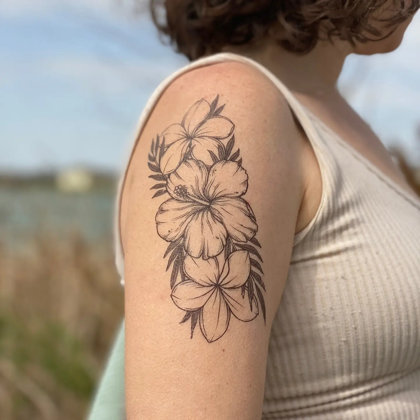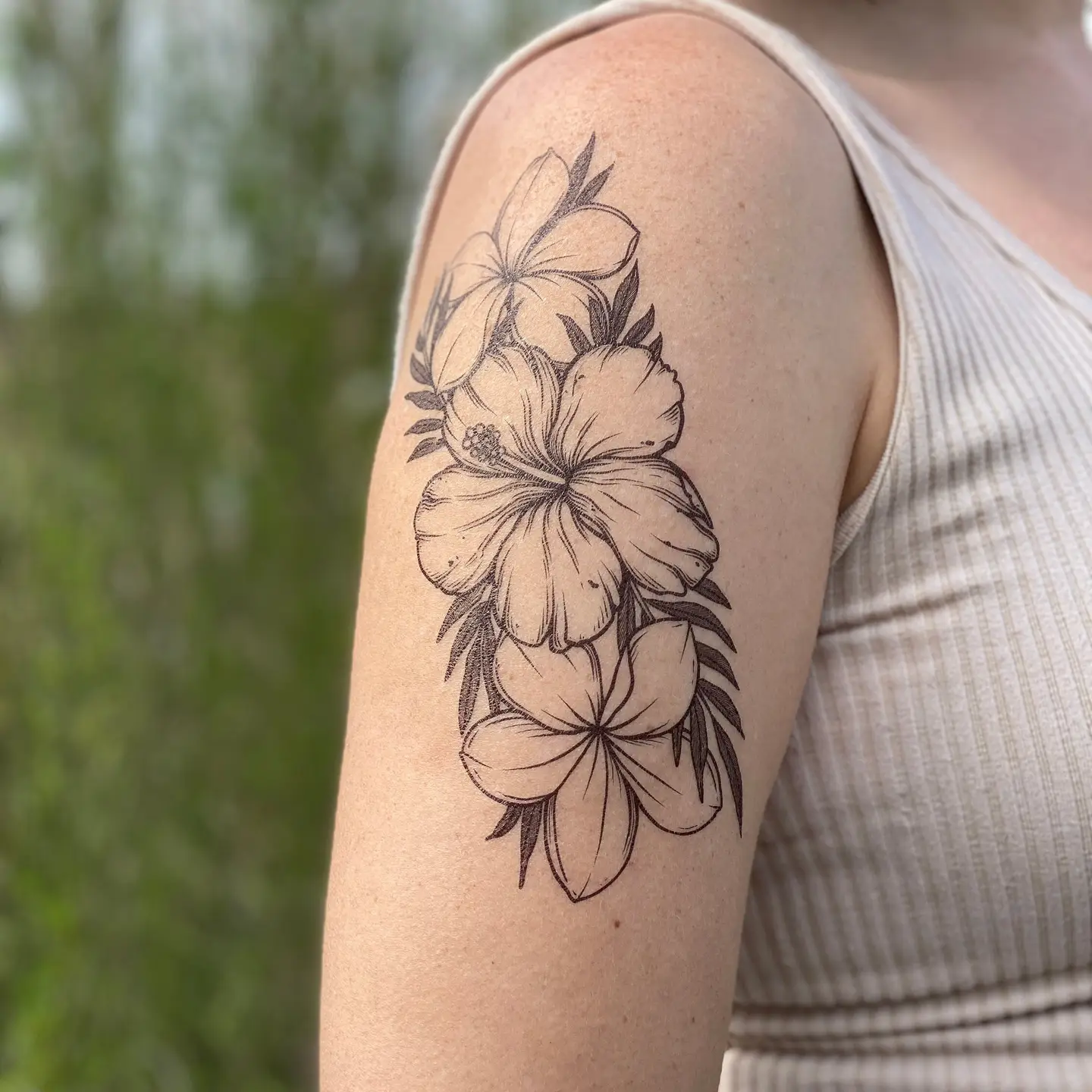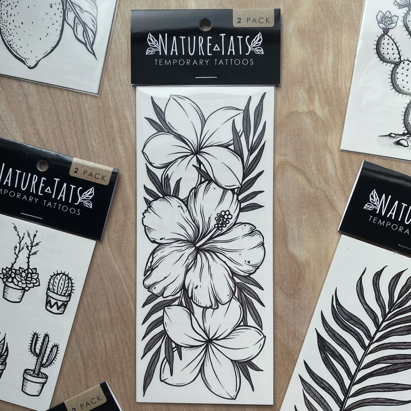 Tropical floral temporary tattoo. This design features a hibiscus flower in the center and two mirrored plumeria flowers, tucked between the petals are dark thin palm leaves that pair perfectly with our Palm Leaf tat. Wear this tat on its own or wear a few to create a partial sleeve. A great choice for a classic floral tat to wear with beachy and tropical vacation vibes