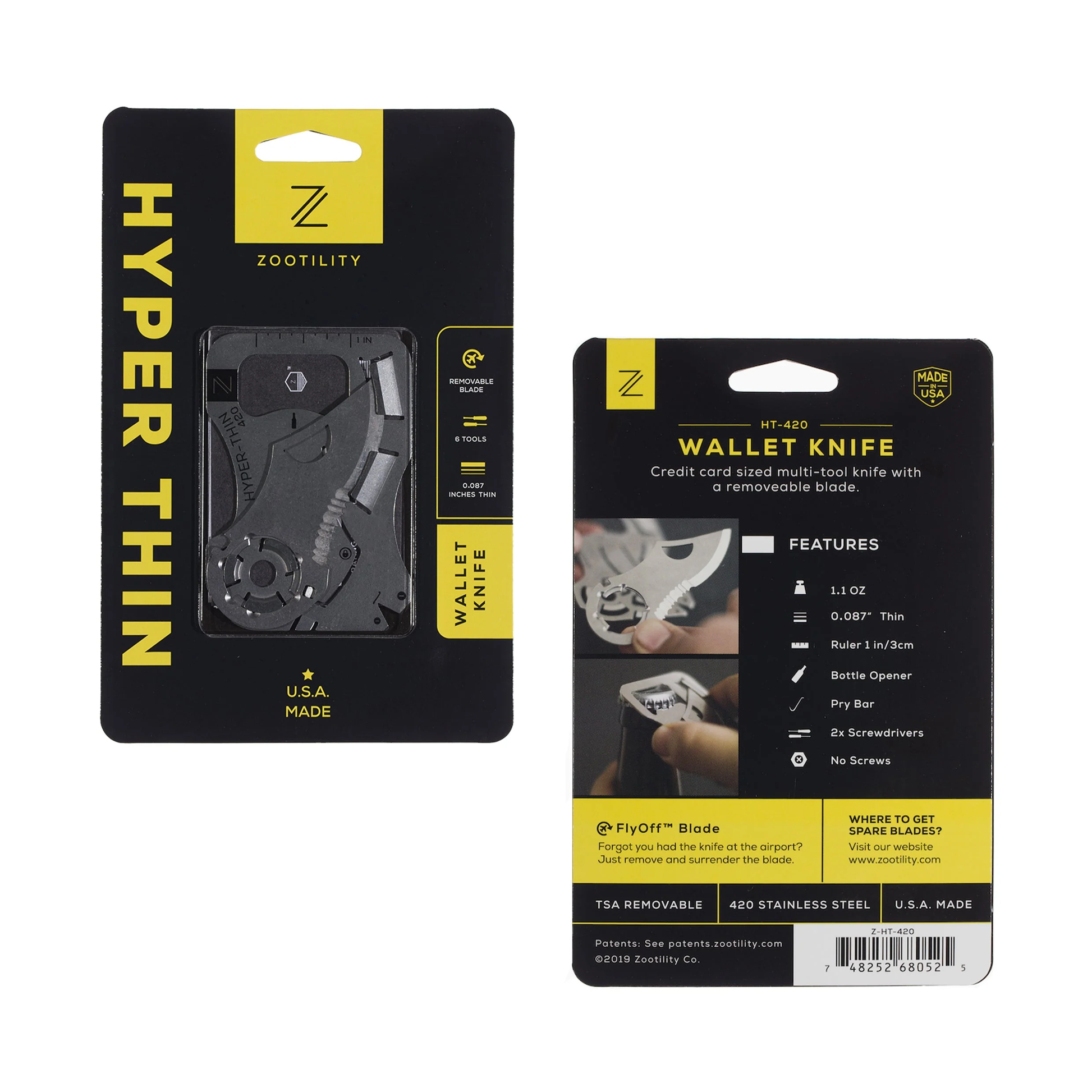 The Hyper Thin Wallet Knife is the "World's Thinnest Pocket Knife". Same as our WildCard, but without the wolf shape. The patented FlyOff technology allows you to remove the blade quickly, and the handle also includes a set of tools: