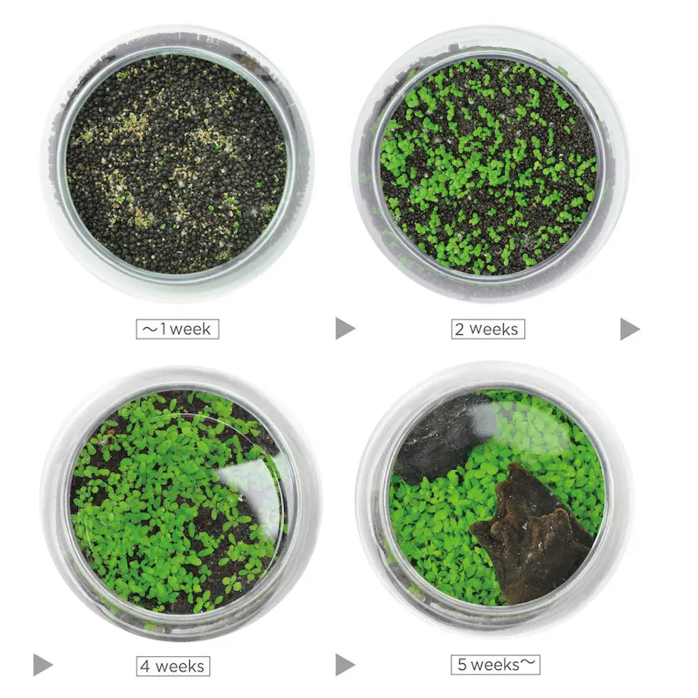 Water Garden creates a serene miniature waterscape filled with lush green plants that have a moss-like appearance. Water Garden is made in Japan and includes everything needed — glass bowl, volcanic gravel, decorative rocks, seeds & instructions. • Origin: Japan • Base Material: Glass, Volcanic Gravel • Seeds Included: Mini-leaf Aquaplant