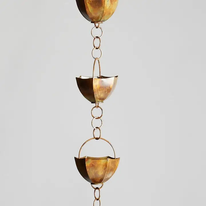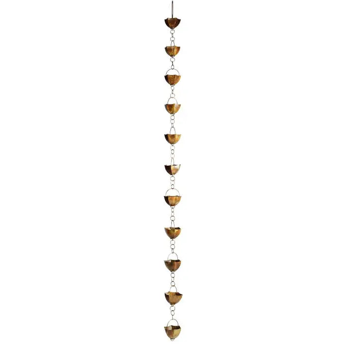 A fascinating alternative to the simple downspout. Rain chain catches rooftop water flow and creates its own watercourse, as water runs down the chain through a succession of 11 copper-colored cups. Iron - Cups are removable to shorten length - Cups are 3.9"W - 7'L - Barcode: 732919466034 - Handcrafted in India