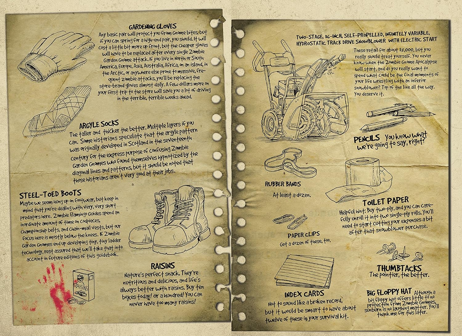 Offering strategies for defense against a zombie gnome invasion, the book provides an extensive list of essential weapons and DIY home-fortification tips. Rare illustrations of zombie gnomes in their natural habitat and a priceless collection of never-before-seen photos (housed in an envelope in the back of the book) make this the go-to guide for survivalists in a zombie gnome-infested world.